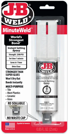 50101 J-B Weld Minute Weld Egy perces színtelen epoxy kerámia, csempe, üveg, kõ, legtöbb kemény mûanyag, fa, fém ragasztására. 2300 PSI kötéserõsség 1 perces felhasználási idõ 1 óra teljes kötésidõ |
